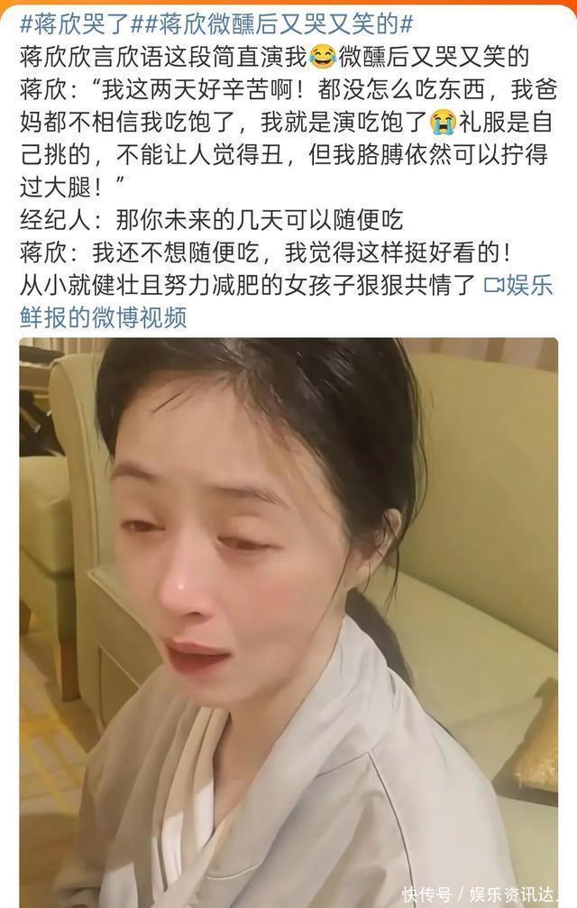 02从视频中蒋欣坦言自己为了穿上精心挑选的礼服维持状态,所以两天的时间几乎没有怎么进食,甚至还要对关心自己的父母撒谎,说自己“吃饱了”!但即使如此,蒋欣依旧坚持“胳膊拧得过大腿”的理念。而蒋欣的经纪人看到她的状态也非常担心,于是劝告蒋欣说接下来几天可以放纵下自己,想吃的美食随便吃。可是蒋欣却拒绝了这一个提议,表示:“不想随便吃,这样挺好看”。事实上,这已经不是蒋欣第一次对抗来自身材上的焦虑了。以前她总是被网友吐槽说“胖”!于是蒋欣就开始从饮食上控制,她的个人社交平台上的动态都是每天的减脂餐!但蒋欣和关晓彤属于一类体质,那就是大骨架!所以即使体重下去了,但无法达到类似鞠婧祎那种娇小的感觉。虽然蒋欣也在控制体重,但她认为作为一个演员,专注的应该是自己的角色而并非以外形来表达。